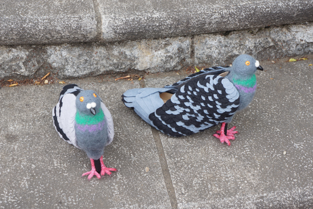 製作完成的鴿子鞋實在有夠像,連顏色都唯妙唯肖。穿上去的時候,鴿子的頭在尾端,尾巴的部分在鞋頭,從後面看過去,彷彿就是真的鴿子。(感覺會跟公園裡的鴿子群非常融入啊!)