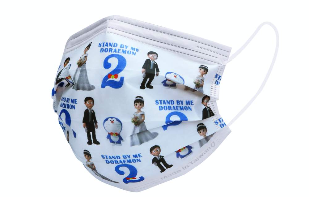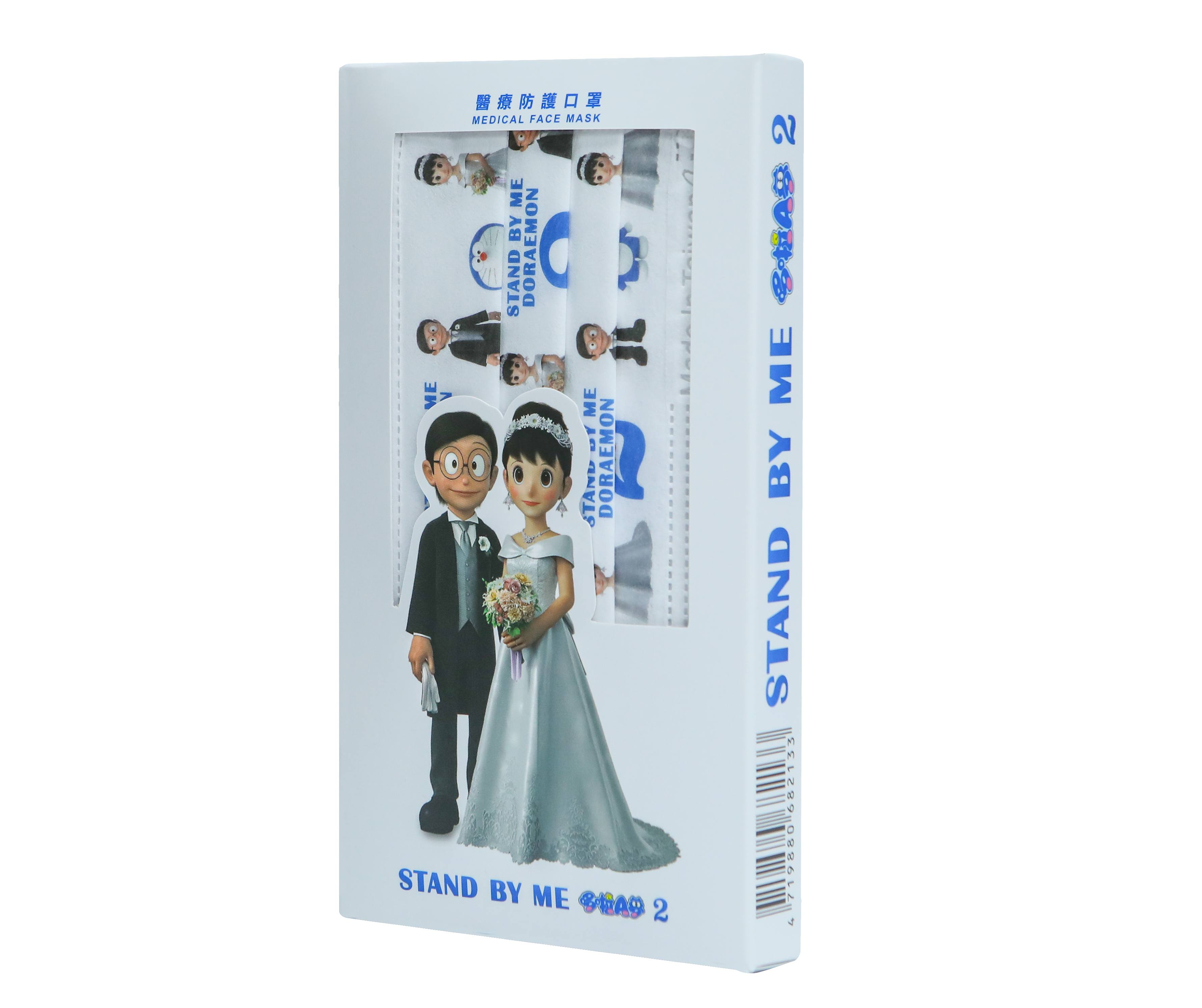 《STAND BY ME 2哆啦A夢》故事講述長大的大雄與靜香攜手踏上紅毯,第三波口罩也緊扣電影主題。「夢幻婚禮款」以穿著帥氣西裝的大雄、手捧捧花的新娘靜香與別著可愛領結的哆啦A夢,紙盒上也放上新人婚紗照,氛圍滿滿的感動!(這款週邊有種婚禮小物的感覺XD)