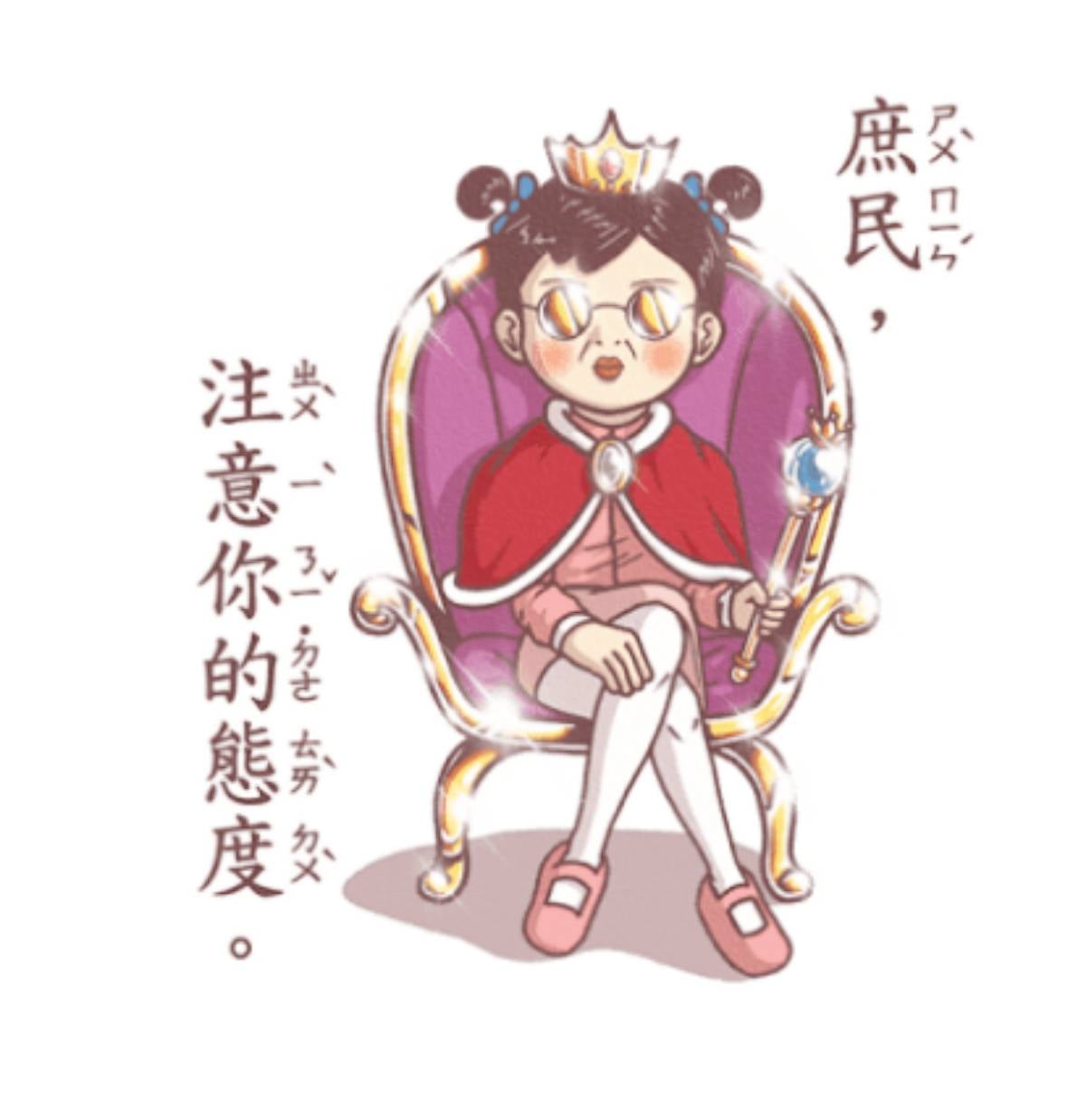 這次推出的貼圖超適合連環傳送(笑),傳完「早安,窮人們」被朋友反嗆後,就再送上這張「庶民,注意你的態度」回敬,現在本王最大,大家不得無禮!(撥髮)(再度提醒慎選對象,不夠熟可能會被報警抓走)