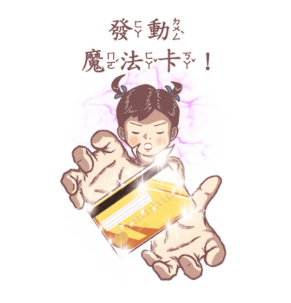 除了暴發戶發言之外,此次貼圖還是有實用款能使用,推坑朋友或自己準備要購物時,就丟出這張「發動魔法卡」貼圖吧!沒有什麼是魔法卡不能解決的事(除非額度不夠),快準備用它把錢錢變成喜歡的樣子!