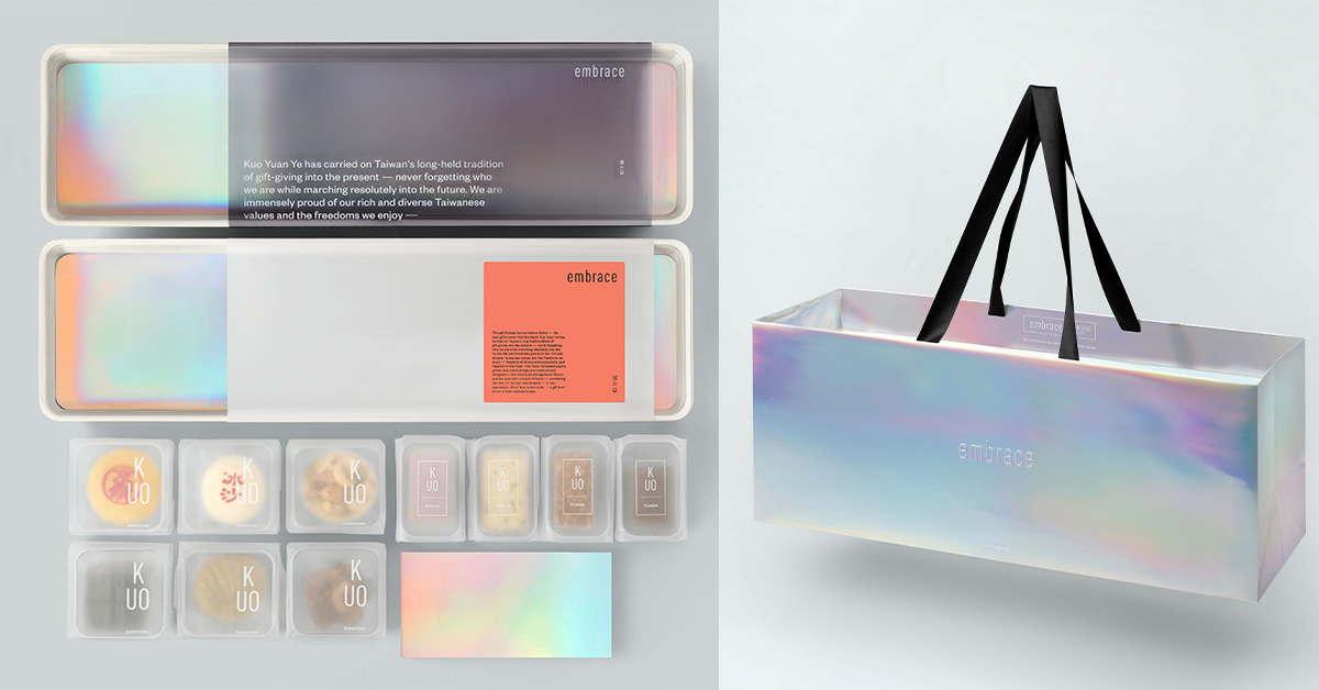 「郭元益 X 聶永真155周年紀念禮盒embrace」外盒設計跳脫既有喜餅框架,長形深盒裝盛雙層糕餅點心,優雅而份量感十足,包裝材質選用喜餅少見的白色紙漿模作為糕點盛器,觸感質樸溫厚,搭配現代感十足的雷射虹彩外包紙,開盒後依光線角度映出不同炫麗色彩,展現對這座島嶼上多樣價值的並存感到驕傲,為送禮的人獻上最美致意。「透過溫潤與銳利、素面與絢彩的並存,以及選用材質的衝撞搭配,期望傳遞經典與當代的對話,擁抱各種文化語言及價值的共存。」睽違5年,郭元益再度邀來設計師聶永真操刀,除了全新訂製喜餅,也帶來品牌對文化禮俗辯證與深層思考。郭元益副總經理郭建偉表示,embrace傳遞「對你的好,不拘一式」,從中西式糕點餅乾、外盒、餅章設計,由內到外給予100%選擇自由,不僅選擇多樣,郭元益開發團隊也為此絞盡腦汁開發出25款時令限定與品牌獨家品項。其中由郭元益師傅全程純手工製作的招牌京饌玉露酥,從傳統12兩首度變身一人樣的小尺寸大餅,兼顧傳統與現代飲食趨勢;花千層的花椒、咖啡口味則是在西式餅乾中加入中式糕餅技法,以0至5度冷水麵糰,在18度環境下夾入澳洲新鮮奶油,中途歷經24小時鬆弛呈現出144層如蟬翼般細片層次,各加入在地獨有花椒、台灣知名fika fika cafe,風味獨特。黑巧酥芝麻白巧、黑巧酥紅豆白巧,以可可粉與全部原料緩緩和勻靜置12小時以上,其中夾餡白巧克力需溶解調合奶油等製品同樣熟成12小時,再包覆內餡,帶來多層次口感,紅豆白巧則由郭元益手熬紅豆製成,融合東西方獨特風味,消費者可以口味喜好自組選出10款最愛口味。