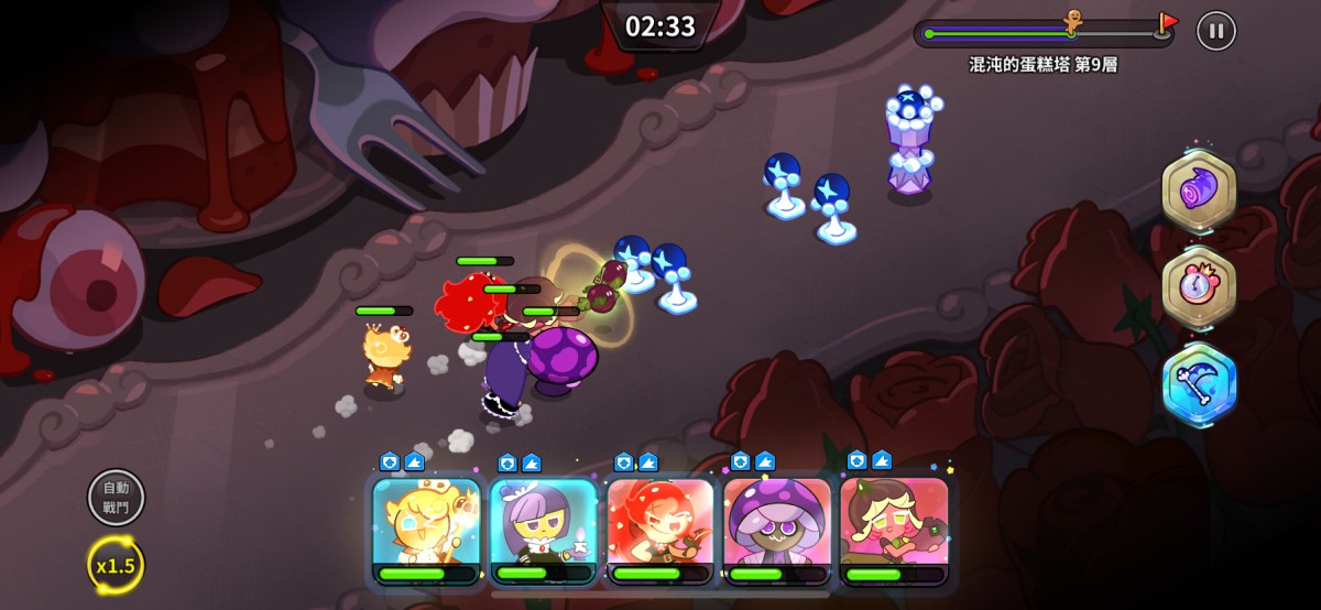 火速來到薑餅人世界探險,戰鬥採用即時戰鬥玩法,依照前排、中排、後排選擇5位餅乾組成一支特萌超強部隊出戰,餅乾都有自己專屬的站位及特殊技能,可以按照關卡需求去配置絕佳的坦克、打手及補師喔!一開始還不懂調配可以選擇「推薦組合」讓電腦自動幫你配出隊伍~