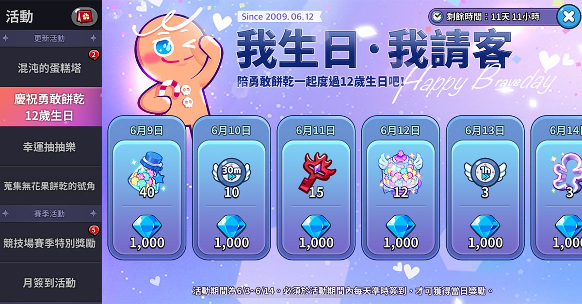 6月不入坑,更待何時?(笑)薑餅人王國6月最大檔活動就是勇敢餅乾12歲生日!!現在登入每天都有好禮可以領,絕對是暢玩的最佳時機!!眼尖的大家可以發現,除了勇敢餅乾生日月可以領超值好禮,其實左方那一排都是獲得遊戲bonus的每日活動!(如此佛心的手遊不玩對不起自己呀)