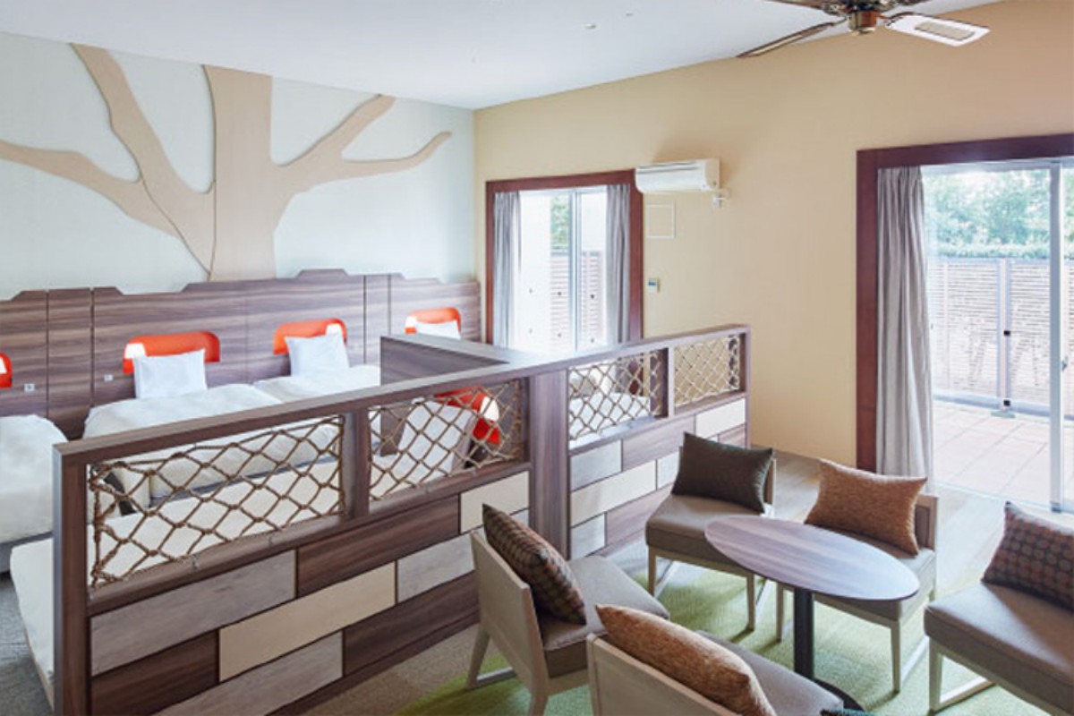 以樹木造型為設計概念的6人房型,讓人有如置身森林小木屋一般。床旁邊有沙發和桌子,在這樣的小客廳裡面,可以讓親朋好友們邊聊天喝茶,邊就近照顧小朋友。而且一個房間有提供兩個廁所以及兩個洗手台,就算多人住宿也不用擔心廁所會不夠用,適合大家族或是多個家族一起住宿。