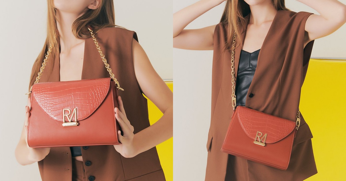 第1款要推薦的是「煙醺搖滾斜背包」,充滿質感的鏈條背帶、石頭紋路,再搭配立體五金RM LOGO,比起鮮豔的大紅色,這種帶點橘色感的南瓜紅反而不會氣勢逼人,非常適合年輕的妞妞們背!