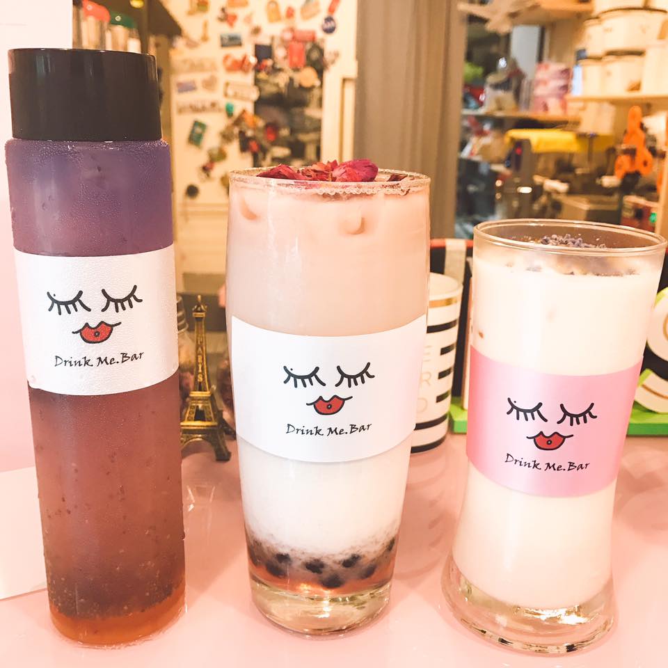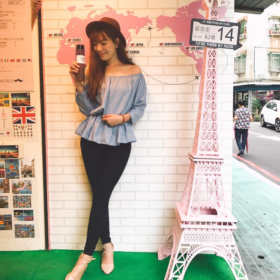 「喝我吧」可愛的logo是空姐老闆依照自己來設計的(眼瞼上的痣是重點)(笑),而門口搶眼的粉色巴黎鐵塔與地圖牆,也是她特別訂製來給大家盡情喝飲料兼拍照,而且還貼心附上腳架與拍照小道具呢!
