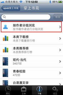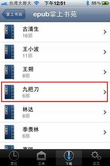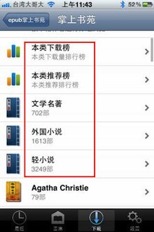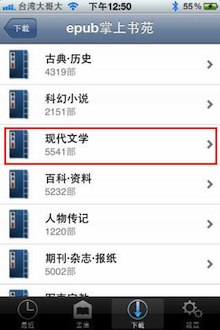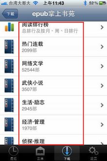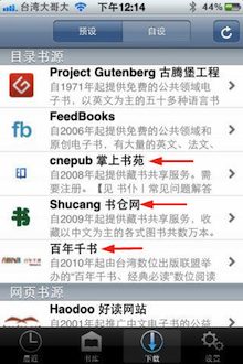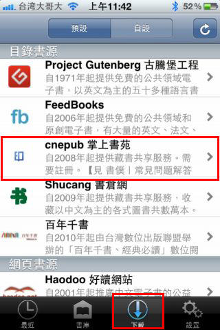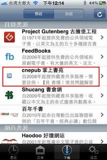 至於「簡繁漢字轉換」的功能,待會你就知道它的厲害了。接著我們就去下載幾本好書吧!點擊下方「下載」選項,就會進入可下載書籍的書源當中。你當然可以任選書源去找尋你所要的書籍,但第一步就從藏書最豐富的「cnepub掌上書苑」開始找起。
