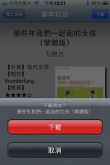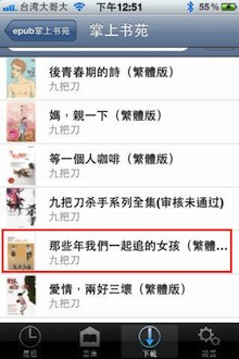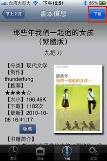 接著我們可以來找找有沒有最近很火熱的書籍,小編是正好想到近來上映的「那年,我們一起追的女孩」電影,就是出自於網路作家九把刀之手,今天就來找找這本書。從下載頁面→「掌上書苑」→「現代文學」→「按作者分類瀏覽」,裏頭果然有火紅的「九把刀」,而在僅有的六本書中竟然也有「那年,我們一起追的女孩」,太好了,這就趕緊來收藏一下,按下右上角的「下載」,之後並輸入你的掌上書苑帳號就可以了。
