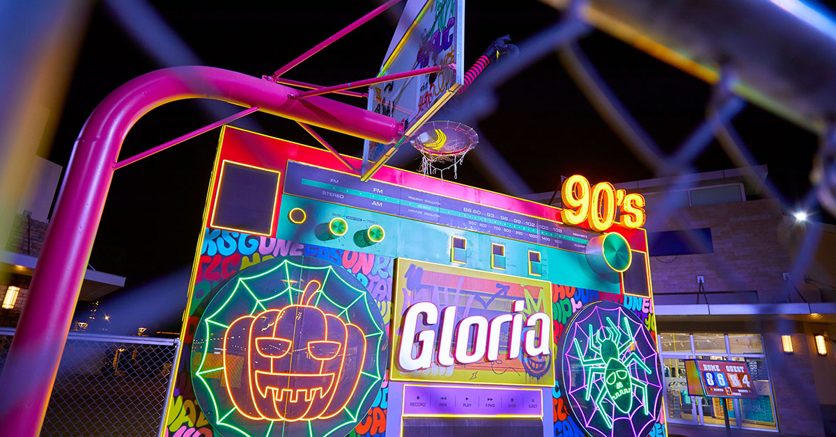 三期「90s Hiphop Forever嘻哈球場」則佈下天羅地網,霓虹蜘蛛網高掛在6.5米的超巨型手提收音機,兩側各有巨型南瓜和蜘蛛,為嘻哈球場增添萬聖超現實色彩。抬頭向左上方看,還能驚見巫婆正帶著掃帚卡在房門口,充滿詼諧與小巧思!場景後方也同樣精彩,在台灣新銳塗鴉創作者Eason & Candy的巧手下,以多彩泡泡字、魔術方塊、噴漆罐等圖像元素,重現美式塗鴉精神。巧妙融合萬聖與Newtro風格,讓每一處都是驚喜與亮點。