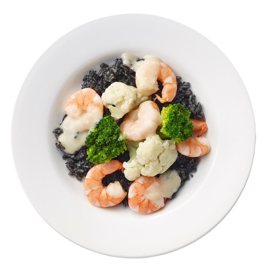 同樣精選ASC認證的「白蝦墨魚飯佐白酒醬」,搭配新鮮的墨魚汁&泰式香米調製而成的墨魚飯,每一口吃起來都粒粒分明、口感滑順;新鮮白蝦Q彈帶勁、白酒醬香氣逼人、墨魚醬汁清甜爽口,夏天當作主餐也不膩口~