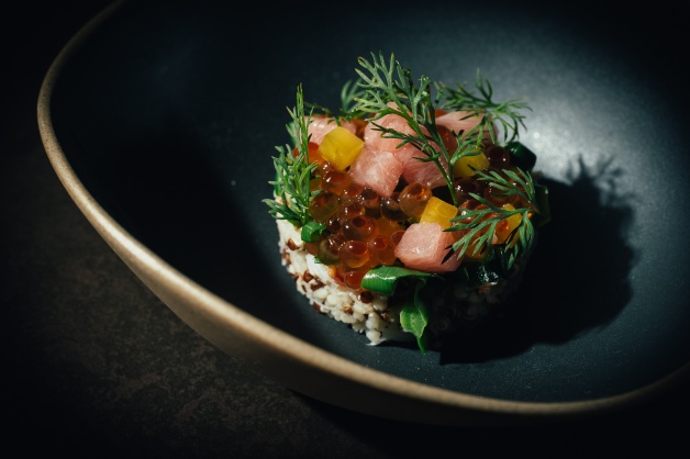 開胃沙拉「森 先付」以技安師傅的散壽司為概念延伸,最底層以北非小米與紅藜麥替換米飯,加上松葉蟹肉、鮪魚中腹、鮭魚卵增添油脂香氣,並以醃漬物、山菜、蒔蘿帶出爽脆口感,是作為進入森林大地的前菜,食用前建議大家先稍微拌開,會將食材的鮮甜和本味發揮到極致!