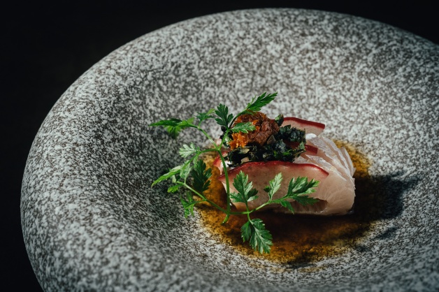 有日式加法式感的「和 造里」,嚴選帶有血合油脂豐富的鰤魚,雖然是生魚片,但卻不使用醬油,而是以加入柴魚高湯的「土佐醋」取代檸檬酸,最上面還有一層固體型態的土佐醋凍,加入油漬刺蔥與番茄,為了保持其風味,就連器皿都是冰石!