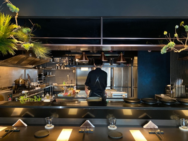 店內總坪數並不大,整體設計選用低調奢華的曜石黑和夜幕藍,搭配霧鐵灰和絲絨綠,空間可分為「板前區」和「方桌區」,板前區席次為8席,如果是一個人或攜伴,建議可以坐在此區,跟一般懷石料理不一樣,妞妞們能夠透過開放式的吧台,看到主廚的料理過程,上菜時還會有詳細的介紹;方桌區則有兩桌,共8席,這邊給予客人較大的隱私,大家在此處也能夠暢談!