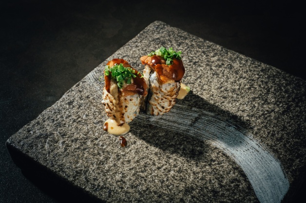 喜歡海膽的妞妞們,絕對會為「淬 食事」為之瘋狂,基底為越光米,以經過烤製的反捲壽司呈現,選用北海道鮮嫩無添加海膽,加入醇香的腐乳元素,佐以鹹香照燒醬,最後以山葵葉點綴,完美呈現高級日料「海膽淬飯」,一口一個剛剛好!
