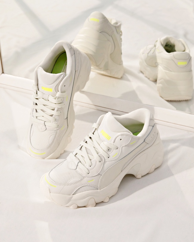 有增高小心機的妞編輯還推這雙! PUMA 家的一直很受歡迎的厚底女神鞋「 Pulsar Wedge 」也可以收燕麥奶夢幻配色,純色鞋面使用網布及皮革異材質拼接單一色系也打造出質感層次,在鞋身細節還點綴「螢光鵝黃線條」,結合堆疊加高的誇張波浪大底,輕甜又不失個性。