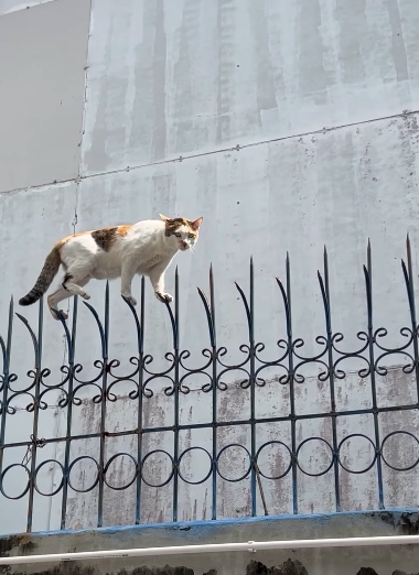 影片中可以看到一堵高牆隔著兩戶人家,而高牆上是採尖銳細鐵條設計,這在預防小偷肯定有很大的效果。只見一隻「三花貓」藝高膽大,在周圍沒有任何緩衝設施的情況下,直接用自己的小小肉球踩在尖銳的圍牆上,接觸面積如此的小,但牠看起來絲毫不畏懼,實在是很帥氣呀!
