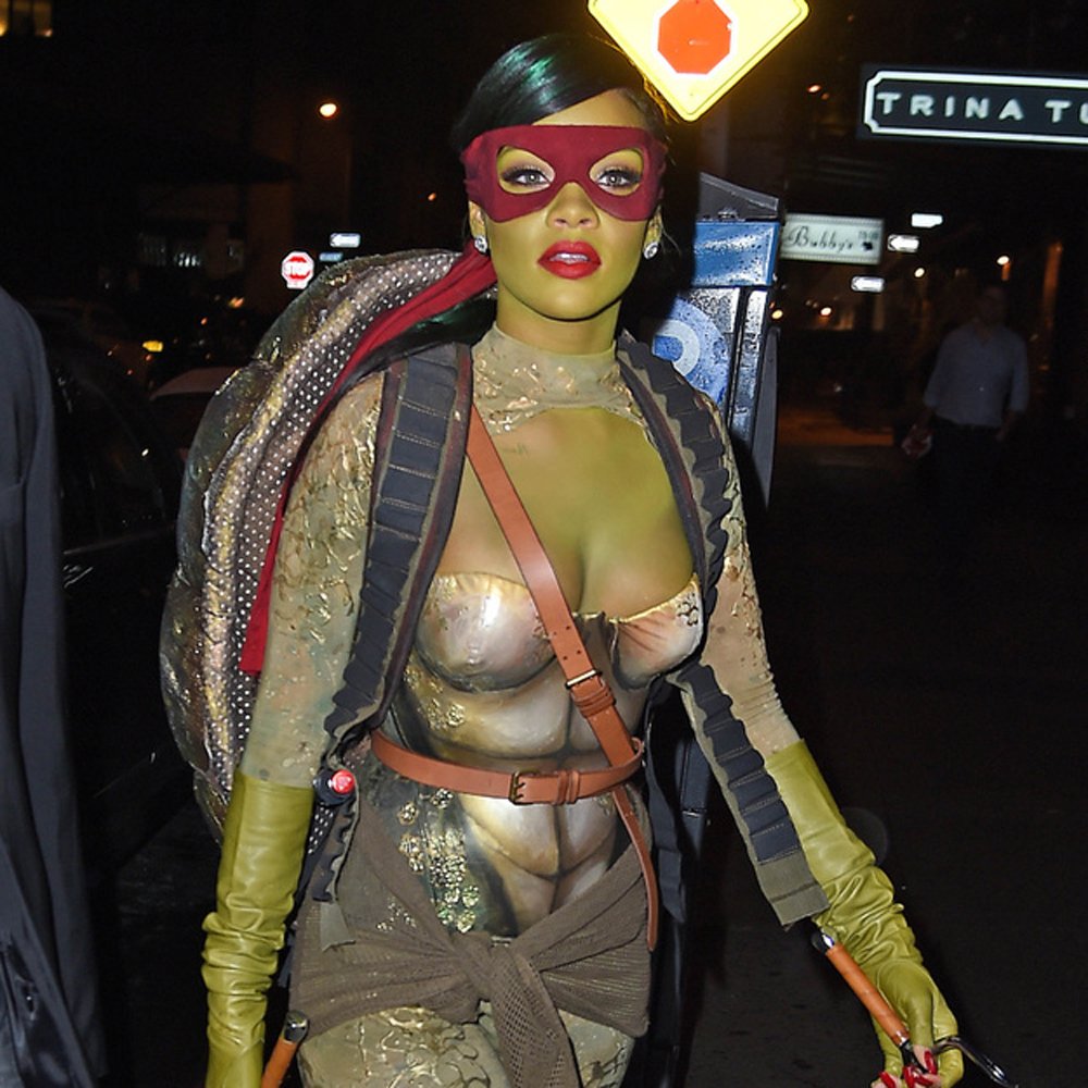 你沒看錯,這就是蕾哈娜!她把自己變成性感的忍者龜,雖然全身塗成綠色,還是能看得出蕾蕾的迷人模樣,連腹肌都弄得唯妙唯俏!實在太厲害了啦~
