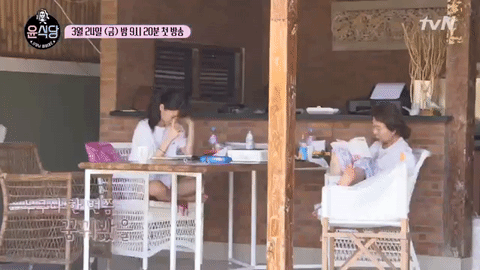 鄭有美、尹汝貞可能被當地的風俗民情影響,整個人都變得超放鬆的~甚至尹汝貞前輩還直接把腿放在桌子上,整個沒在在意形象。