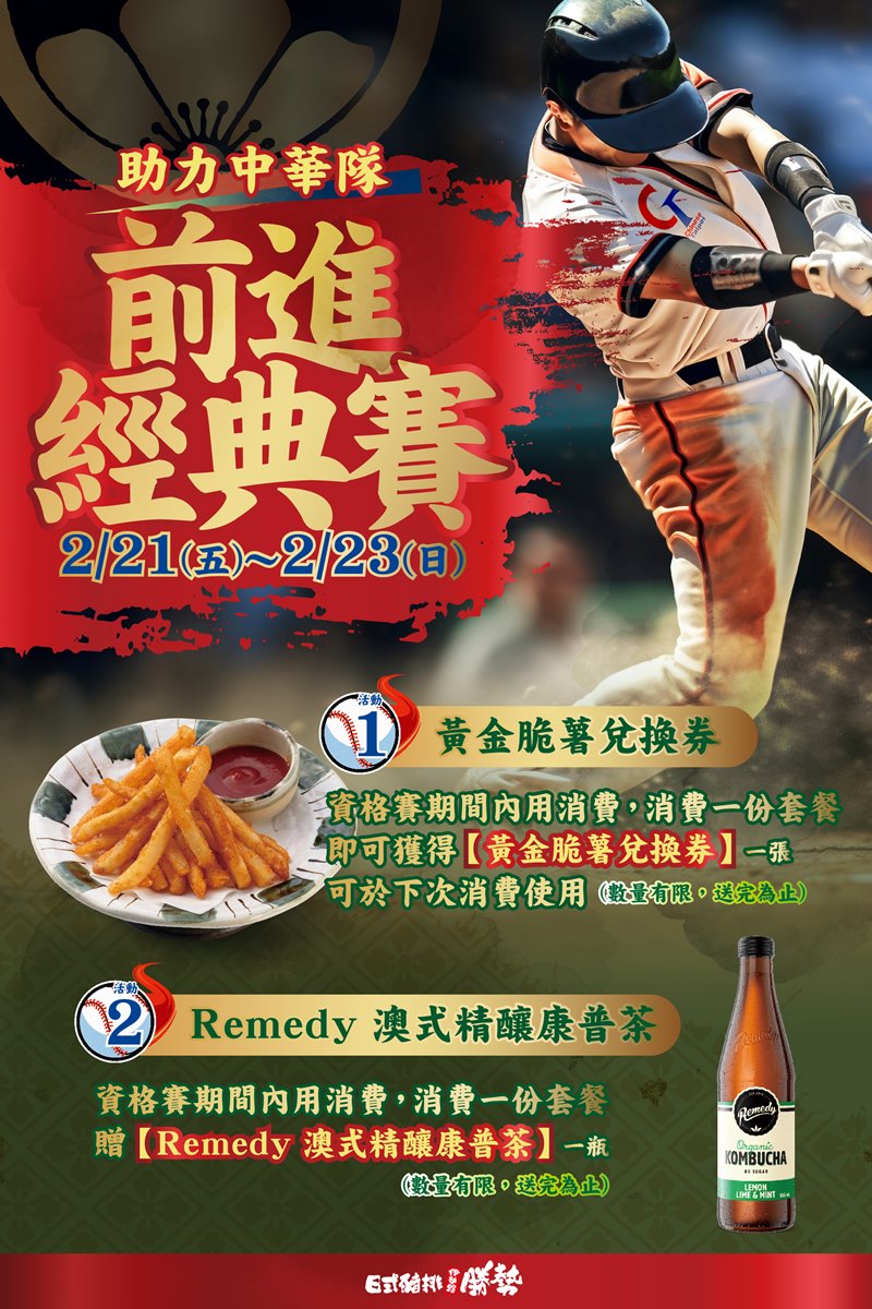 還記得全台灣人為世界棒球賽喝采、感動的時刻嗎?再度集結球迷團結一心的「世界棒球經典賽資格賽」到來,精彩賽事已於台北大巨蛋熱血展開。以「勝」為名帶來吉利之意的「伊勢路—勝勢日式豬排」於賽事期間2月21日23共為期三天,只要到「伊勢路—勝勢日式豬排 大巨蛋店」用餐,立即送「Remedy 澳式精釀康普茶(價值150元)」,再送「黃金脆薯兌換券(價值100元)」,讓我們一起為中華隊助力應援!