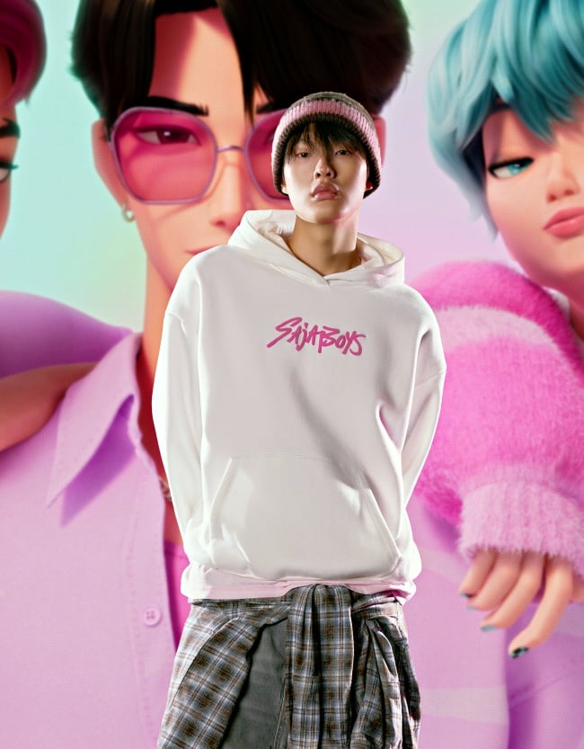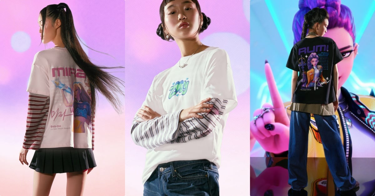 HUNTR/X主題服飾包含連帽衫、運動褲以及T恤,最吸睛的就是還原魯米(Rumi)、米拉(Mira)、佐依(Zoey)在舞台上的帥美模樣的「3人3色上衣」,正面是成員名字,背後是滿版印花,結合未來感的電光色調對比,找姐妹湊一團一起穿,百怪不侵、魂門立刻打開(笑)。