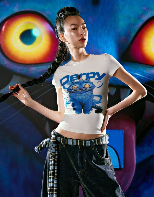 頭上站著三眼喜鵲Sussie的藍色老虎「Derpy」也有專屬設計,超大生動印花搭配白粉色調T恤平衡黑暗感、萌度狂加,抱歉了!振宇,我要把祂們打包帶回家啦~