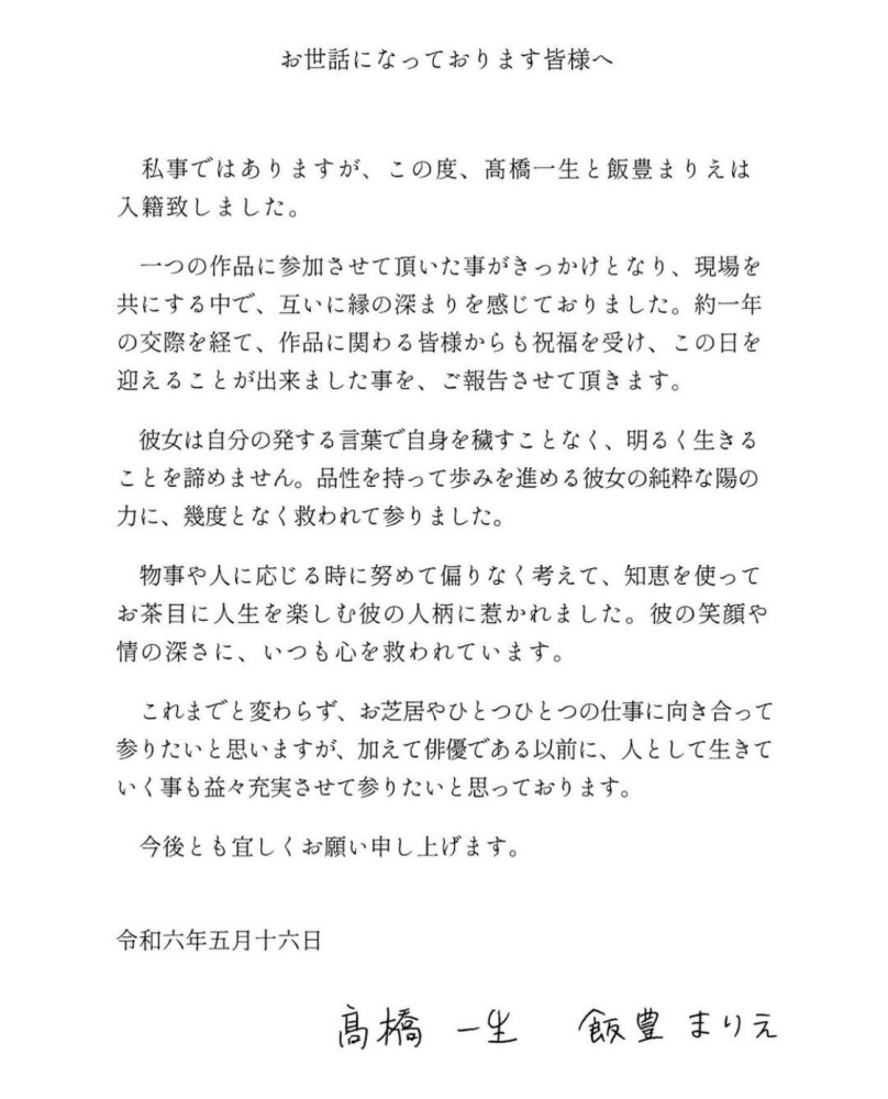 高橋一生和飯豐萬理江因動漫《JOJO的奇幻冒險》衍生日劇《岸邊露伴一動也不動》結緣,並在2022年時被爆出交往消息,相差17歲的戀情在當時引發眾人討論。如今,兩人將共同邁向人生的下一階段,讓粉絲們感到欣慰。