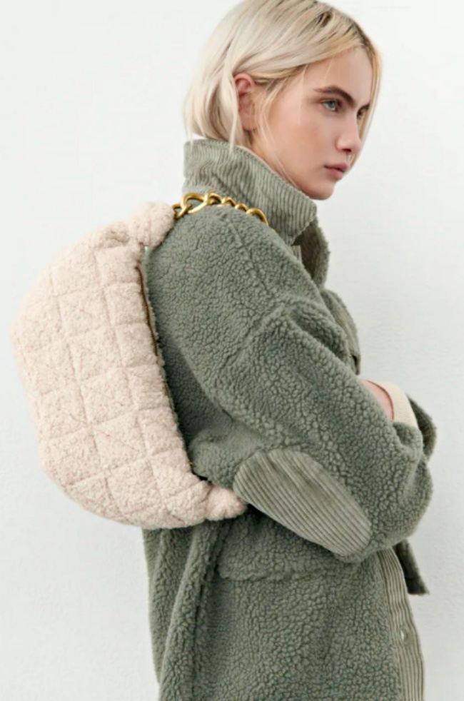 簡約人、個性派可以考慮這款毛毛包!ZARA另一款燕麥米配色的單肩包,搭配低調的短毛設計,不用擔心絨毛太「澎湃」會害羞(笑),在外層還用緝線細節裝飾、加上金色粗鏈條背帶,簡單又不失細節。