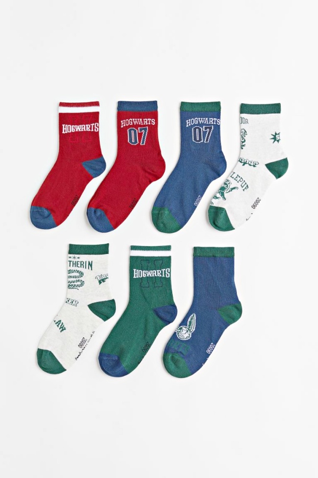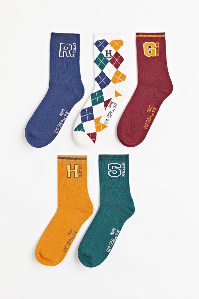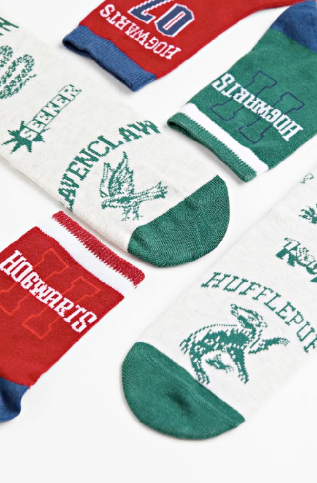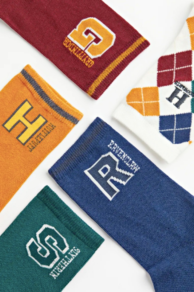 上學造型備妥後,別忘了加入襪子完善「最強巫師學生穿搭」…分別以葛萊分多紅、史萊哲林綠、赫夫帕夫黃、雷文克勞藍4大學院代表色打造而成,上面裝飾學院音文字母,同時有最不會出錯的(?)「霍格華茲版的學校襪」!另外,加入哈利波特魁地奇比賽7號球衣、金探子設計的聯名款式也超有梗~