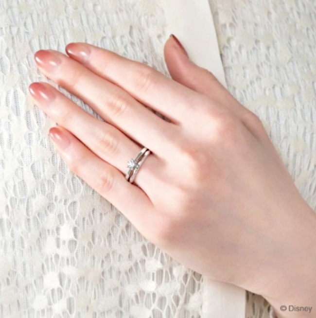 乍看是簡約優雅的白金鑽石婚戒,其實藏著「愛麗兒的祝福」!仔細看鑽石的側邊,也用白金材質刻劃出一朵栩栩如生的花朵,這朵就是愛麗兒在動畫中戴在頭髮上髮飾,低調又偷偷別具夢幻童話意義。
