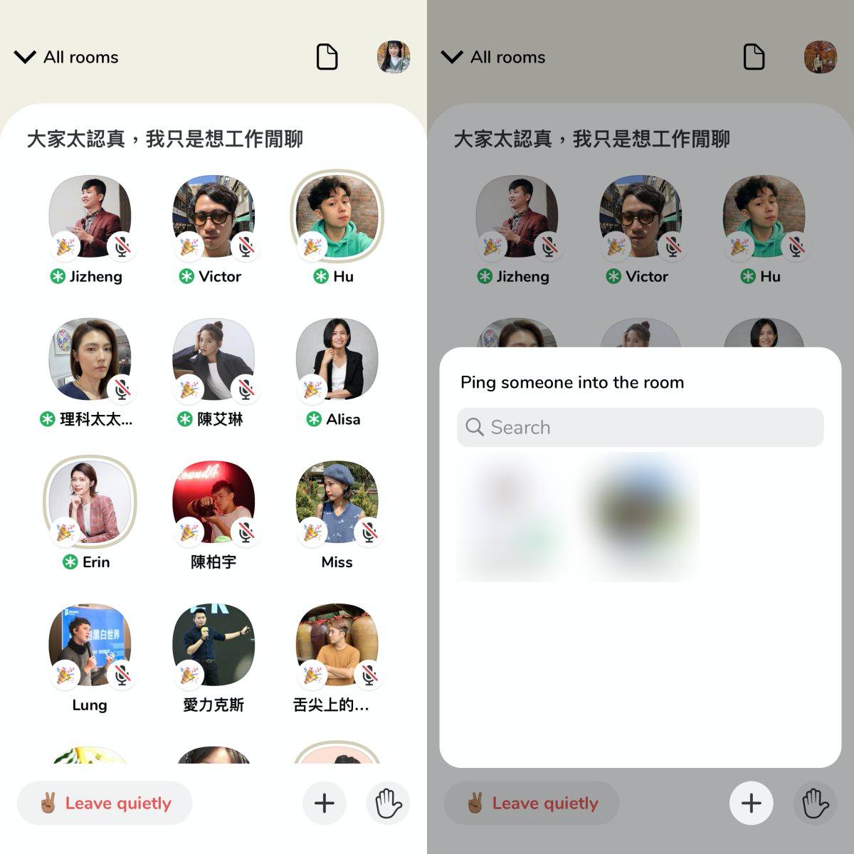 《Clubhouse》最大特色就是除了可與世界各地網友交流之外,還讓我們有機會與平常很難接觸到的名人對談。小房間內名字前有綠色標記的用戶為主持人,當頭像出現灰色框框代表他在發話,若想加入話題,點選右下方的「舉手」,等到主持人選擇你後即可發言。按「+」可邀請朋友加入房間,若想離開房間,就點左下角的「Leace quietly」。