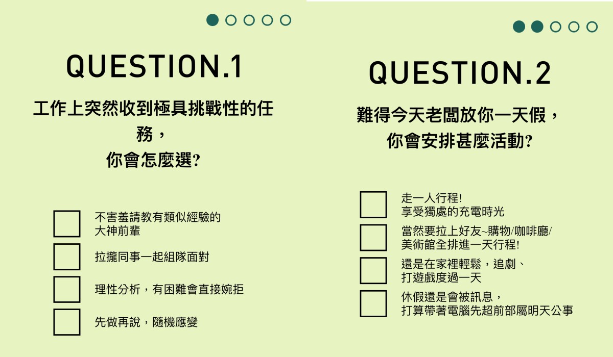 在職場上我們都可能會接收到不同的任務,來到第1個問題,當你在工作上突然收到極具挑戰性的任務,這時你會選擇怎麼做呢?是拉攏同事一起完成,求救有經驗的前輩,還是理性分析後覺得有困難乾脆直接婉拒?第2題老闆佛心突然放你一天假,你要選擇怎麼安排,是享受一個人的行程,還是只想宅在家放鬆追劇?