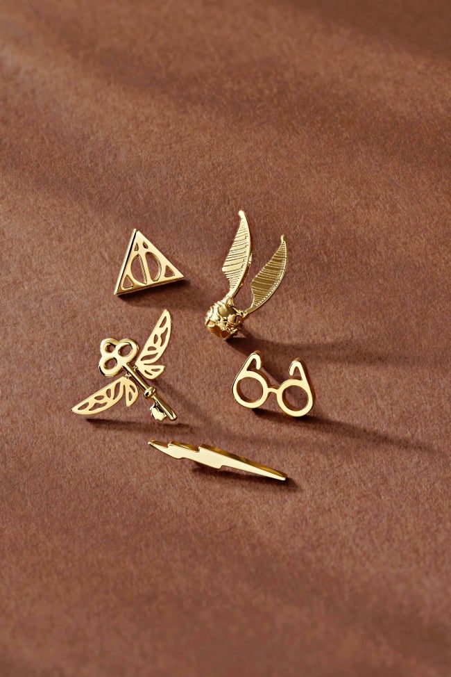 只有巫師可以穿過的9又4分之3月台、映照出內心渴望的意若思鏡以及夜空下的霍格華茲城堡也被打造成「金色聯名項鍊」,同時還可以收死神的聖物、哈利波特閃電印記、有翅膀的飛行鑰匙的迷你版耳環,甚至連「金探子」都能用耳尖抓住。