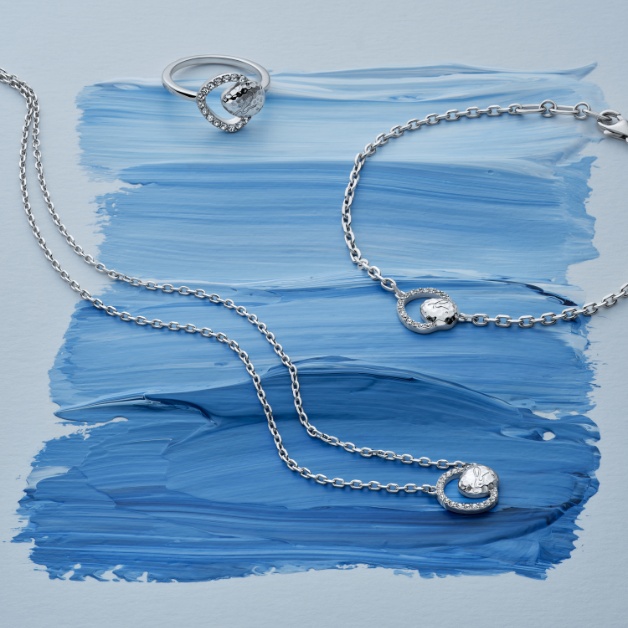 Agnès女士從大自然獲得靈感,全新推出Clarity系列。以輕柔的雲朵為設計理念,視覺焦點落於b. Logo水滴形墜飾,周圍環繞施華洛世奇水晶襯托。b. Logo水滴墜飾表面歷經細膩的錘打工序,呈現不同明暗的凹凸花紋,與白雲朵朵的意象呼應。系列包含戒指、耳環、項鍊及手鍊,採純銀製造,輪廓簡潔大方,完美烘托女士空靈純粹的氣質。