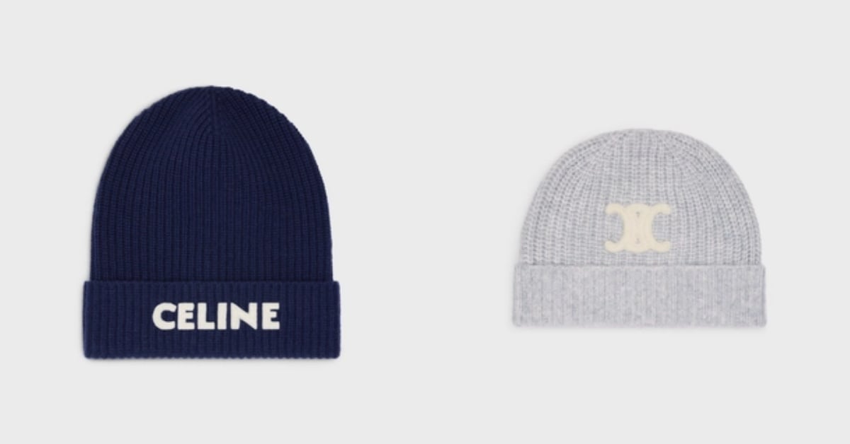 海藍色羅紋羊毛CELINE軟帽NT.13,000、淡灰色無縫羊絨TRIOMPHE刺繡軟帽 NT.20,500