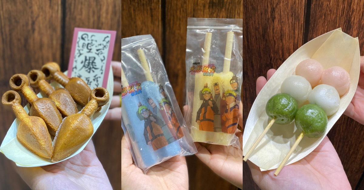 還記得鳴人得知好色仙人(自來也老師)的死訊時,一個人失魂落魄地坐在椅子上,手拿雙棍冰棒的噴淚場景嗎?在周邊商品店的尾端處買得到!吃完之後別急著丟,冰棒棍上有經典台詞。動畫裡的木葉上忍紅豆老師愛吃的三色糰子,獨家苦無雞蛋糕通通都吃得到~