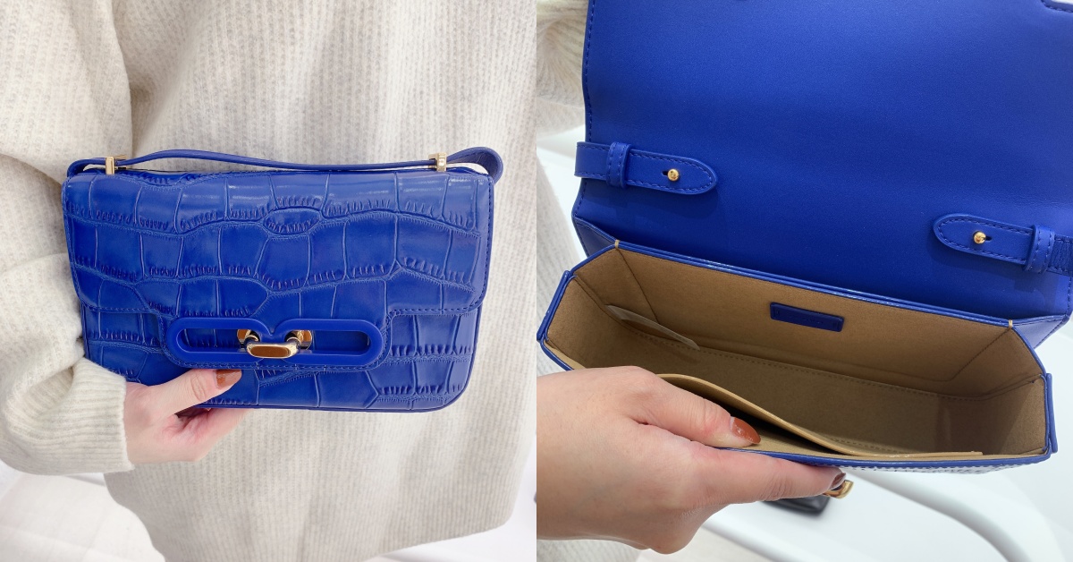 小方包就是一個怎麼買都不會出錯的單品,寶藍色的包身以鱷魚皮革壓紋設計,包改上搭配的是金色的旋鈕包口開合,包內的收納空間非常夠,無論手機、錢包、卡夾全部都放得進去,作為真皮製作的支線,包包的價格在5千元內就能入手喔!