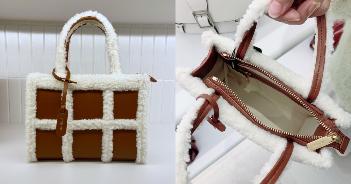 冬天最適合來一咖的毛毛小包PEDRO也有喔~焦糖色的皮革包身,從手把開始到包身輪廓都以白色羔羊毛造型裝飾,光看就覺得超暖和,而包身上也以羔羊毛打造出格紋造型的設計,提把處還有品牌Logo金色燙印的皮革標,質感非常好,冷氣團來期必備一咖。