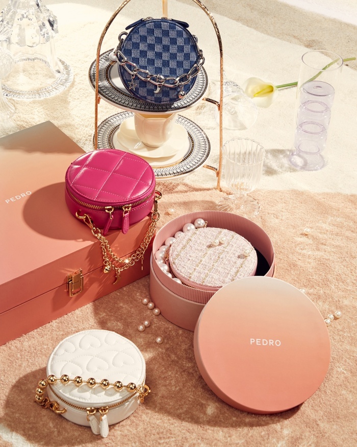 迎接聖誕及年末派對的到來,PEDRO也為大家送上了四合一迷你包禮盒,集結愛心圖案、毛呢包身、衍縫格紋與牛仔布四款不同風格的圓形迷你包,搭配上珍珠、鎖鏈、金球等四條可隨意拆卸搭配的華麗鏈帶,一盒就能隨意混搭出多款自己最喜歡的風格小包!