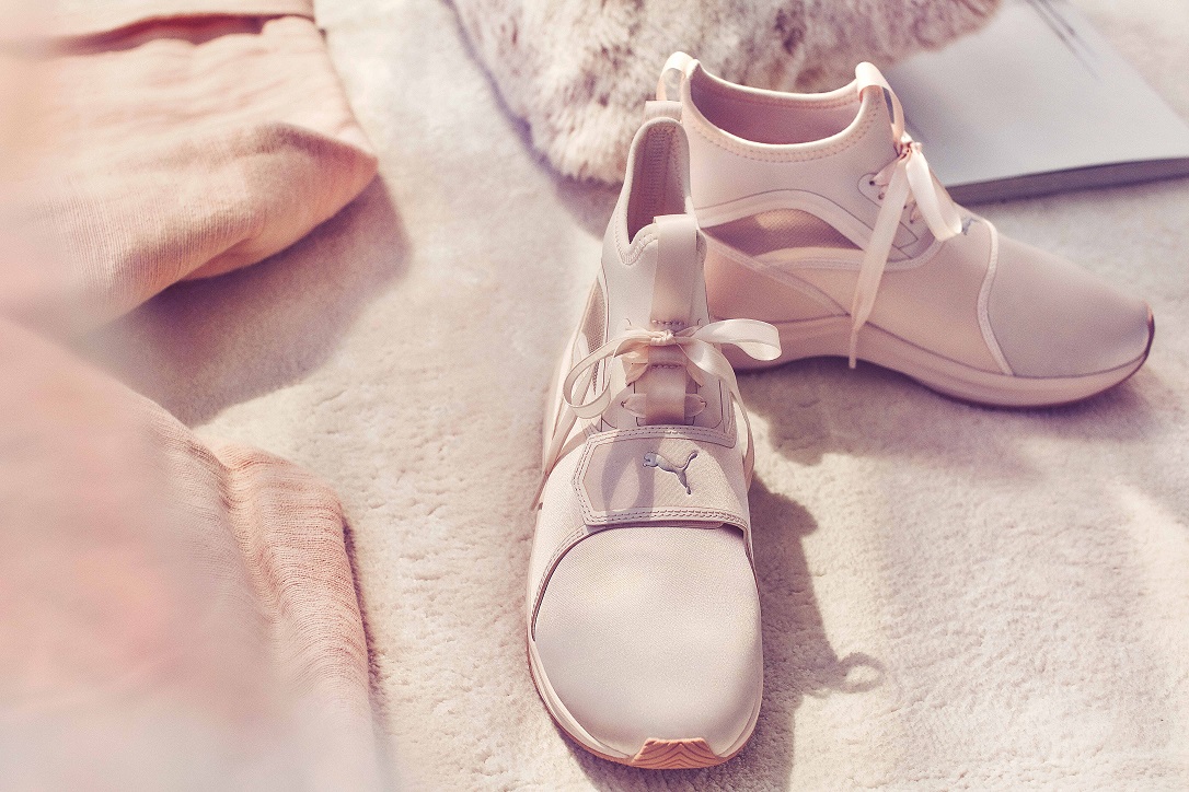 本季 PUMA EN POINTE 運動女力系列推出 PUMA Phenom Satin 及 PUMA Phenom Low Satin 兩款高、低筒緞面訓練勁履,採用緞面網布及網層拼接鞋面,提供運動訓練時足部的大量透氣需求,鞋身大底則加入 PUMA 超人氣 IGNITE 彈力科技,PUMA Phenom Satin 特別於鞋身上增加黏扣帶及襪套式鞋口設計,提供運動與訓練時的足部穩定性。
