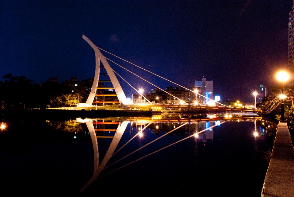 新臨安橋是台南市區熱門的夜景景點,跨越平靜無波的安平運河,造型優美的斜張橋造型,在LED燈照射下閃耀迷人光彩,與渠水倒影交織出浪漫景色。