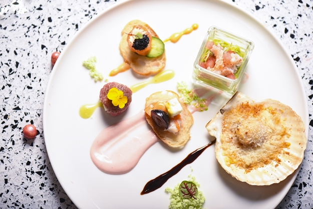 台北W飯店x Benefit聯名「W玩妝特務」下午茶包含每人一份主廚特製風味鹹點,以W品牌和Benefit共有的潮流趣味形象,設計出結合東西方食材元素的精巧點心:燻鮭魚搭風乾番茄、龍蝦醬汁干貝、和牛壽司球、鮮蝦佐菲達起司、葡萄和味噌醬,以及帝王蟹搭配酪梨、西瓜和蘿勒油粉末。除了風味鹹點,還有十一款玩妝系列甜點於吧檯陳列,賓客可無限取用:粉紅芭樂美妝遮瑕馬卡龍以Benefit「BOI-ING美妝橡皮擦系列」粉色圓盒包裝為靈感,將紅心芭樂和白巧克力製成酸甜馬卡龍內餡,化身為可以品嘗的遮瑕慕斯!櫻桃酒巧克力粉紅唇將櫻桃利口酒加入黑巧克力,粉色紅唇造型提升美顏好感度。嘖嘖稱齊百香果乳酪慕斯覆盆子巧克力塔外觀是Benefit「嘖嘖稱齊激光毛孔隱形露」,內餡是百香果乳酪慕斯,搭配覆盆子內餡的巧克力塔,酸甜滋味迎接春天戀愛氣息!