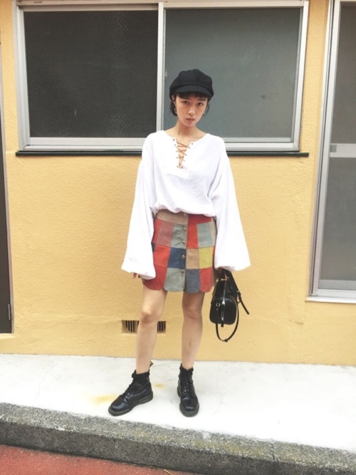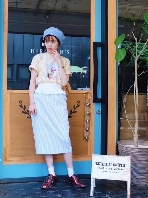 天空藍的單品看起來就是清爽,鵝黃色踢搭配高腰水藍色窄裙,巧妙將休閒混搭甜美感,再用藍色貝雷帽作點綴,打造出亮眼的日系女孩風。