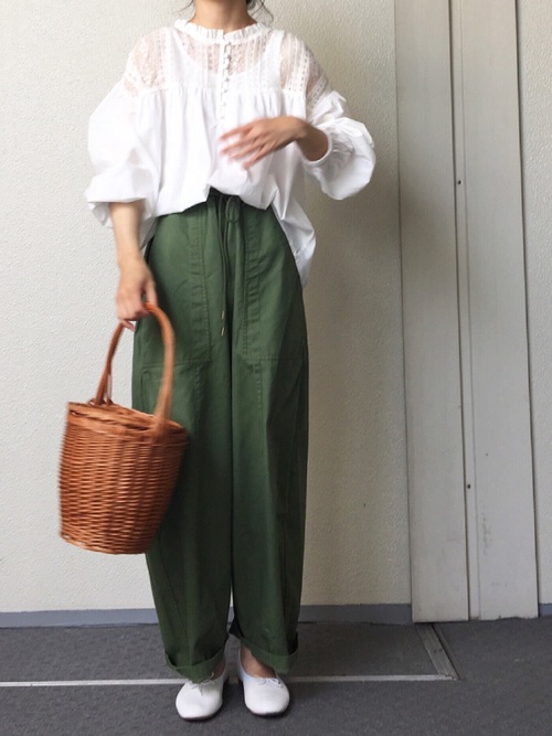 蓬袖透視感上衣搭配綠色花苞剪裁寬褲,以寬×寬的穿搭,將上衣內紮抓出比例,達到修飾身形的效果之外,也能創造甜美休閒的風格。