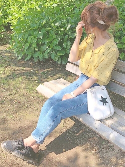 鮮豔的黃色鏤空襯衫簡單搭配高腰牛仔褲,挑選具有小細節設計的單品,即便是休閒感,也能透出甜美女孩的氣息。