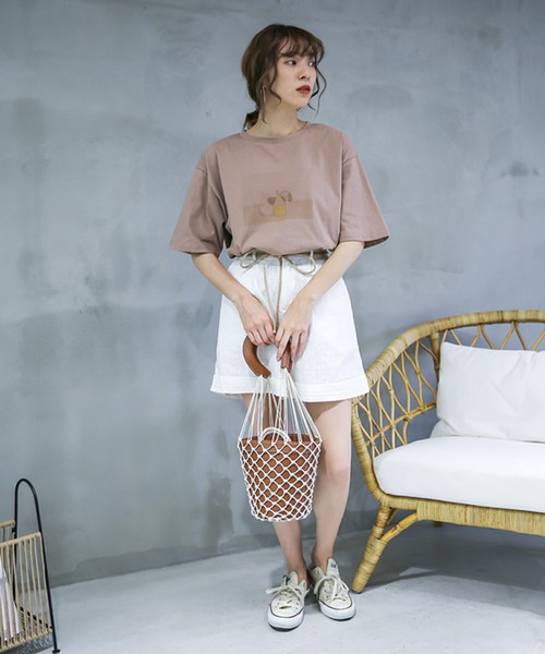 咖啡色圖案上衣×白色短褲的夏日清爽穿搭,腳踩白色帆布鞋再加上金牛流行的水桶包,整體用咖啡色和白色,營造出簡約休閒的風格。