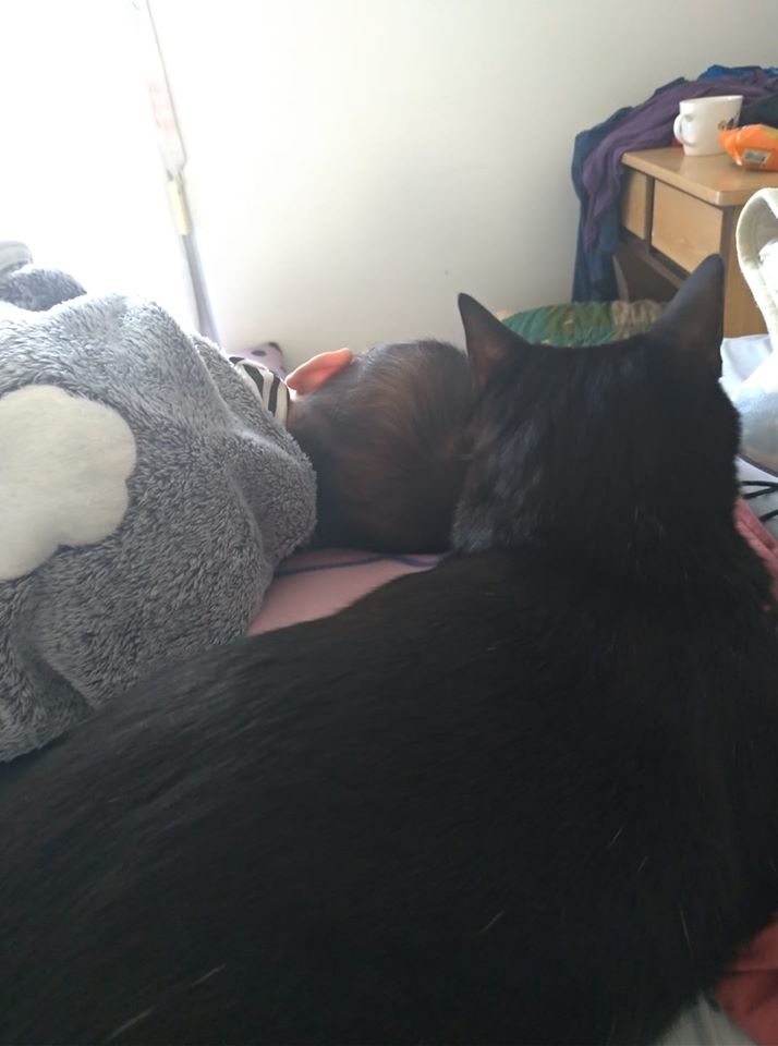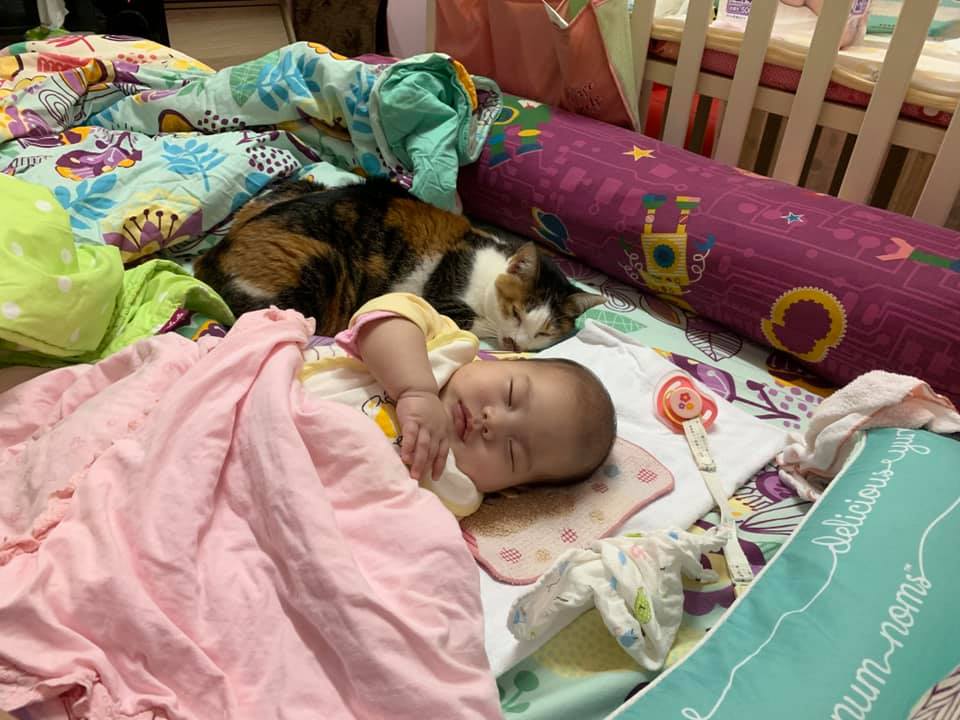 很多毛寶貝都會挨著小嬰兒一起睡覺呢~就好像在守護自己的小弟弟、妹妹一樣!