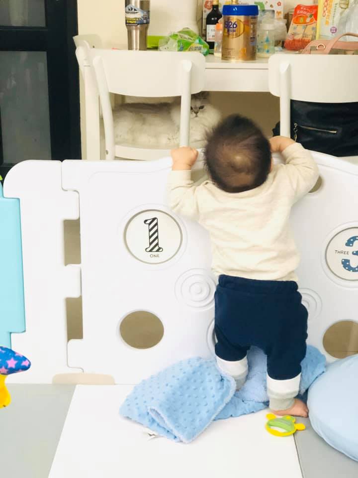 家裡養了一貓一狗。不同的生物也能激發孩子對這世界的好奇心呢~話說,大家能看得到貓咪在哪嗎?