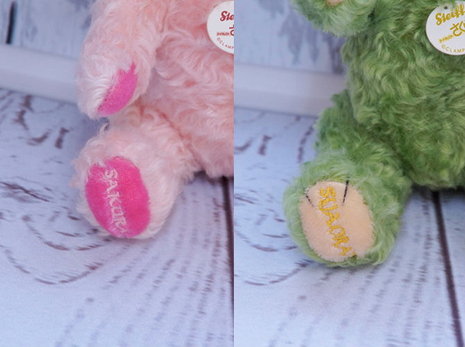 看顏色應該就能清楚分辨,粉紅色的熊是小櫻,小狼則是抹茶色的。(一個櫻花抹茶的搭配)如果分不出來也沒關係,在熊熊的右腳底分別有他們的名字刺繡,粉紅熊熊刺的是跟身體同色的「SAKURA」,綠色熊熊則刺了金色的「SHAORAN」。