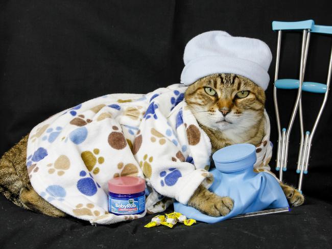 病人造型也有!?拐杖、冰袋、藥膏等一應俱全,請問主人是在整牠嗎(大笑)
