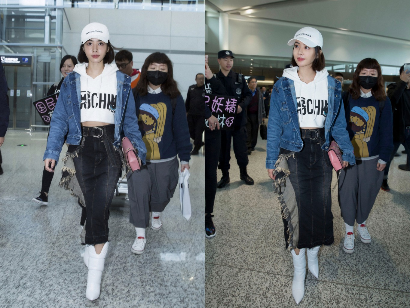 蔡依林穿著短版連帽上衣,搭配黑色窄裙和白色跟靴,以丹寧元素穿出率性又微性感風格。